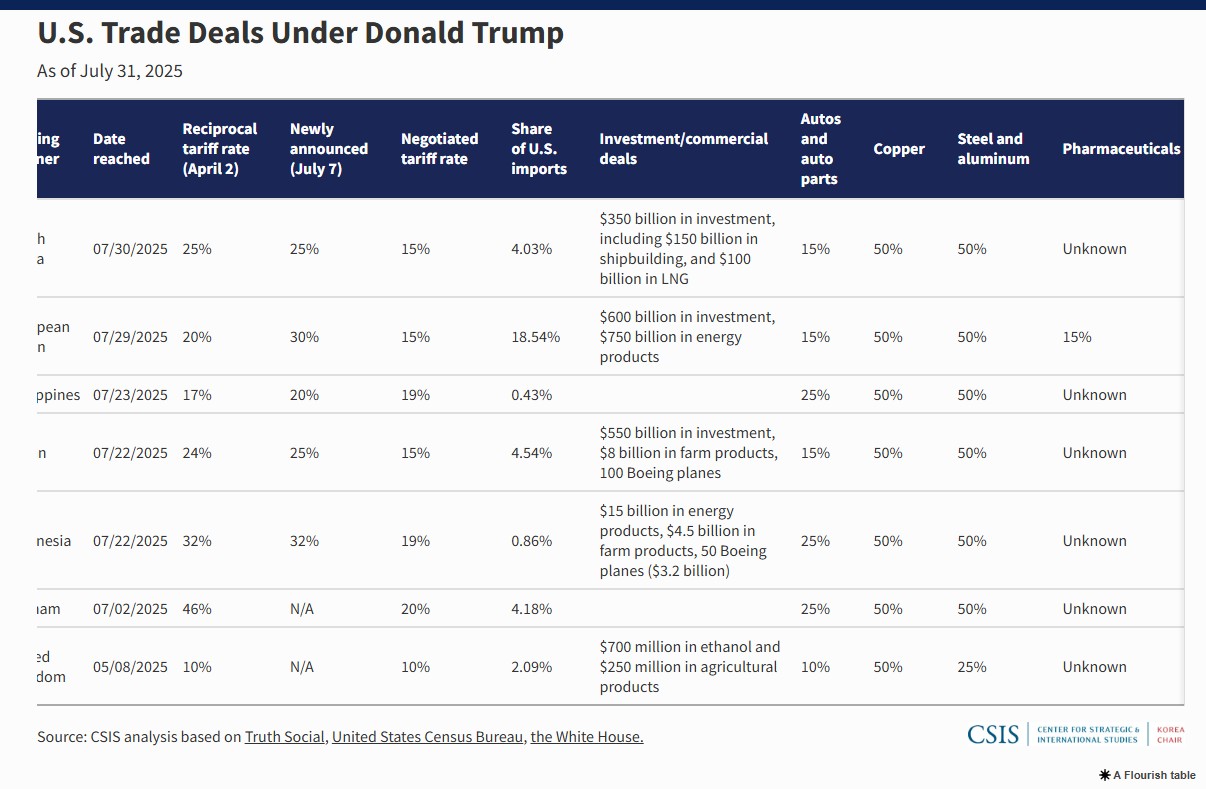 CSIS가 정리한 주요 협상 조건 비교에 따르면 한국은 수입 점유율이 낮음에도 불구하고 큰 투자 유치를 이끌어냈고, 자동차·철강 관세 부담이 있는 대신 외교적 균형을 유지한 것으로 보입니다.