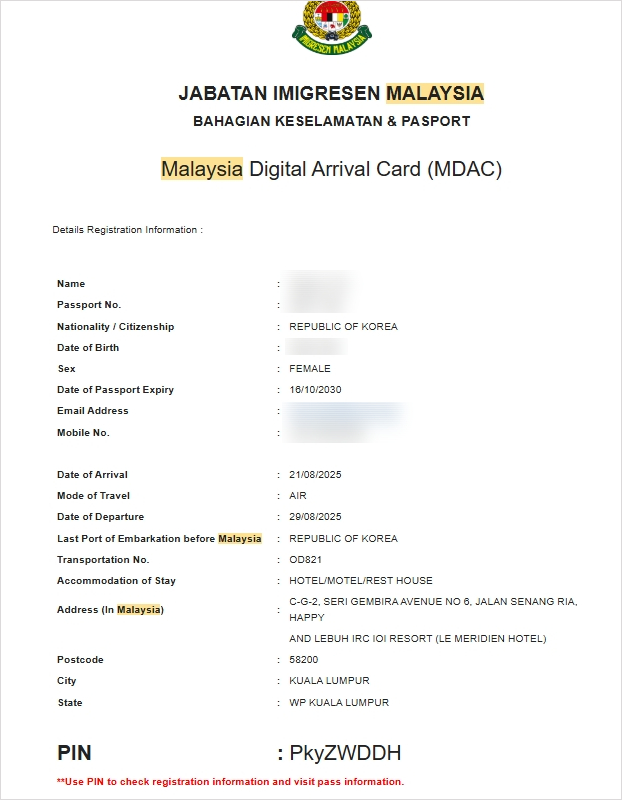말레이시아 MDAC 개인정보 기재란 사진 관련,