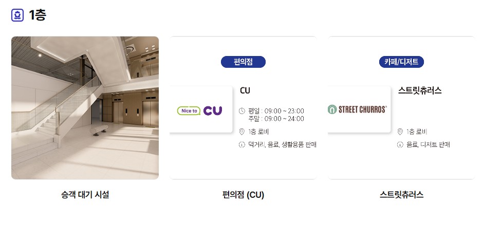 • 1층: CU 편의점, 츄러스 전문점, 대기실